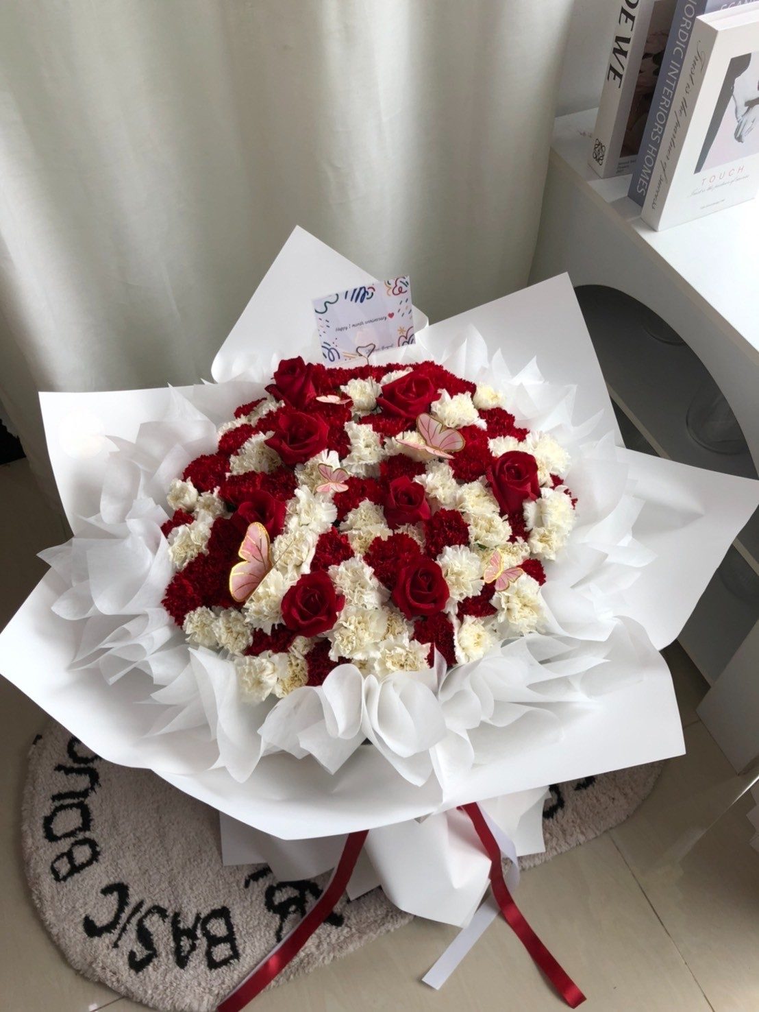 • ดอกไม้หลัก: การผสมผสานอย่างประณีตของกุหลาบแดงเกรดพรีเมียม (Red Roses) และดอกคาร์เนชั่นสีแดง-ขาว จัดวางสลับสีแบบมีจังหวะ ช่วยให้ช่อดูมีมิติและดูหรูหราแบบคลาสสิก