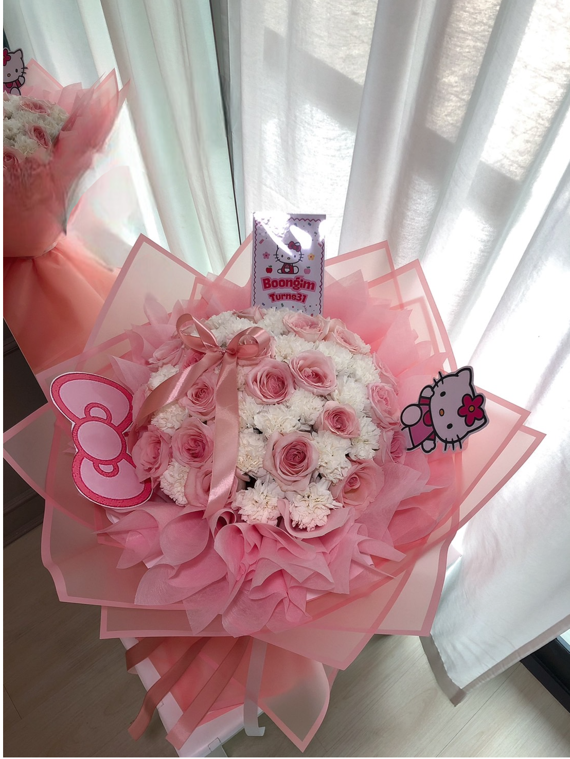 ลูกเล่นพิเศษ: ตกแต่งด้วยป้ายและตุ๊กตาประดับธีมตัวการ์ตูนน่ารัก (Hello Kitty) เพิ่มความสดใสและเป็นเอกลักษณ์ เหมาะสำหรับมอบให้คนที่รักในสไตล์ขี้เล่นและอบอุ่น