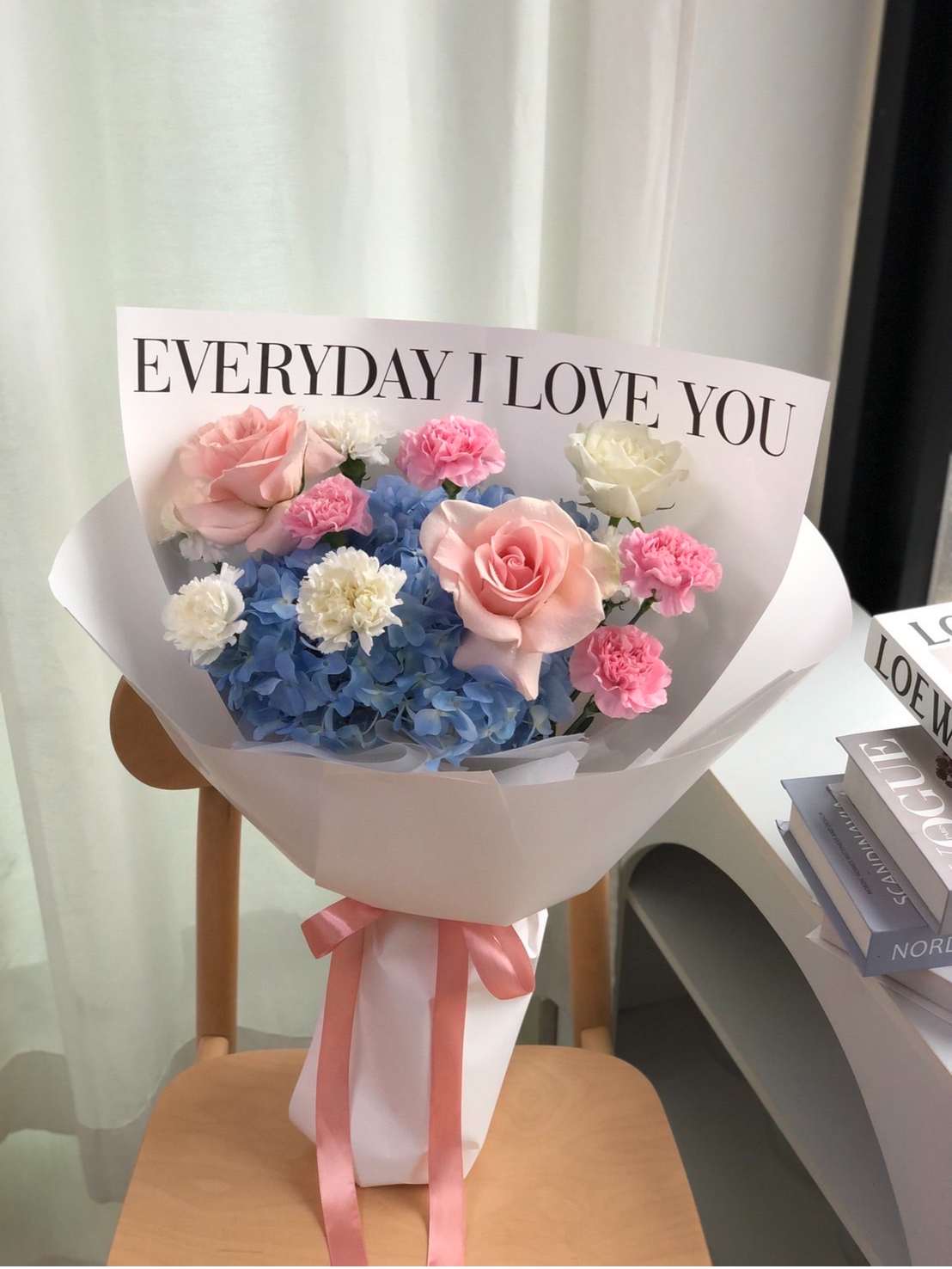 • ดอกไม้หลัก: ดอกไฮเดรนเยีย (Hydrangea) สีฟ้าสดใสเป็นฐานช่อ, ดอกกุหลาบ (Roses) สีชมพูพีชและขาว