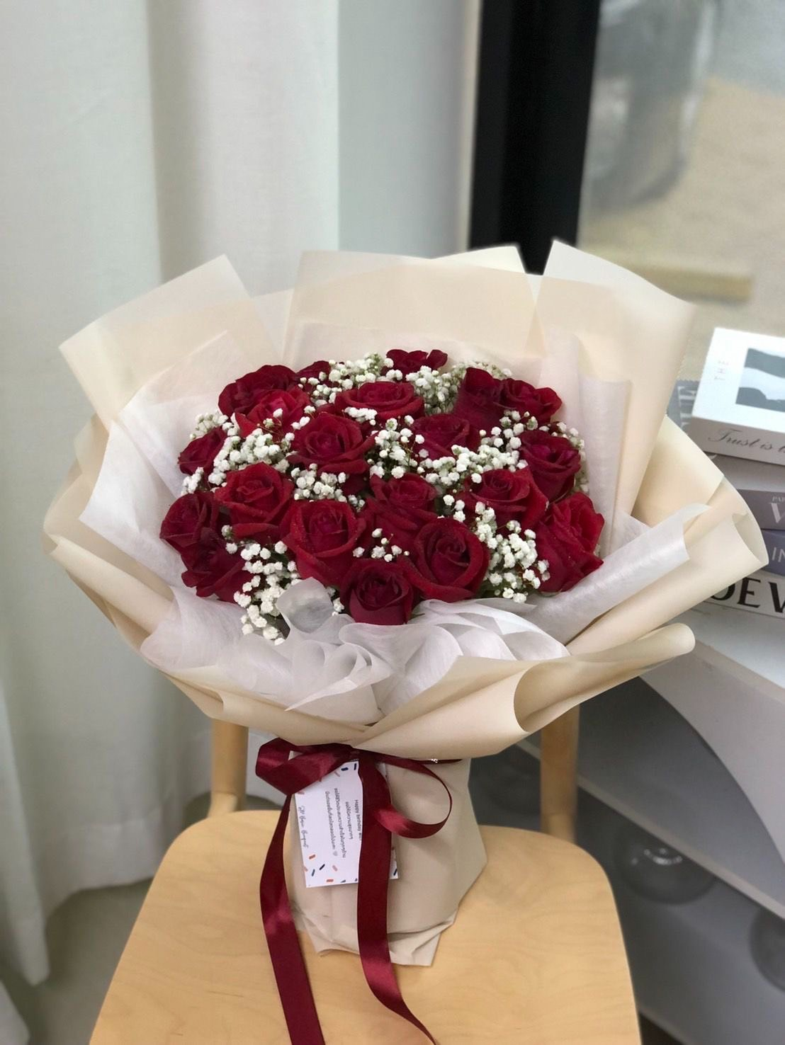 การตกแต่ง: ผูกโบว์ริบบิ้นผ้าซาตินสีแดงเบอร์กันดี (Burgundy Red) เข้าชุด ช่วยเสริมความลักชูรีให้กับช่อดอกไม้