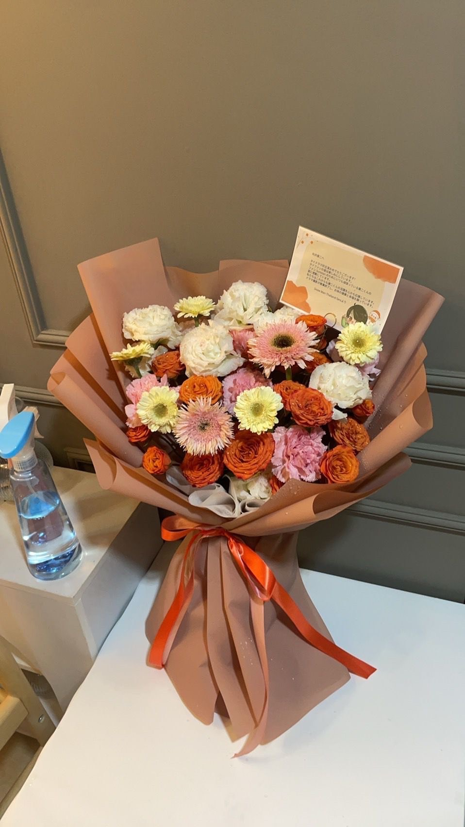 • การตกแต่ง: ผูกด้วยโบว์ริบบิ้นสีส้มสดใส (Bright Orange Ribbon) เข้ากับโทนสีของดอกไม้ พร้อมประดับการ์ดอวยพร