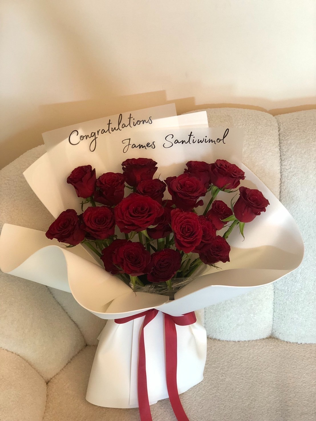 การตกแต่ง: เพิ่มความพิเศษด้วยการสกรีนหรือเขียนข้อความ “Congratulations” และชื่อผู้รับบนแผ่นรองหลังช่อดอกไม้ ปิดท้ายด้วยการผูกโบว์ผ้าซาตินสีแดงเบอร์กันดีที่เข้าชุดกับสีของดอกไม้