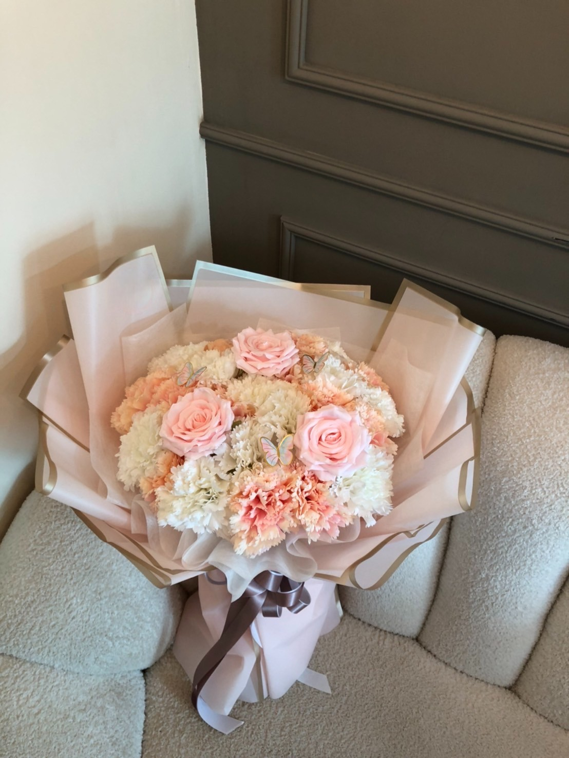 ดอกคาร์เนชั่นสีครีมและสีพีช (Cream & Peach Carnations): ช่วยเพิ่มความแน่นและความฟูให้กับช่อดอกไม้ สื่อถึงความรักที่บริสุทธิ์