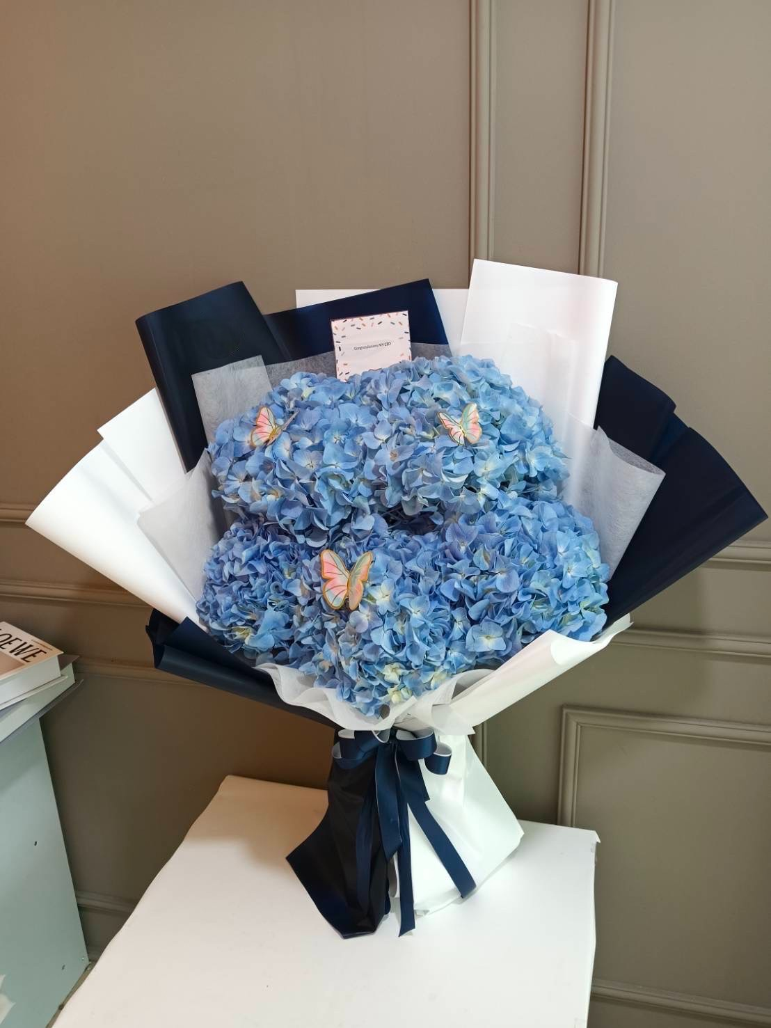 • ดอกไม้หลัก: ดอกไฮเดรนเยียสีฟ้า (Blue Hydrangeas) เกรดพรีเมียม ดอกใหญ่และหนาแน่น สื่อถึงความกตัญญู ความเข้าใจ และความจริงใจที่ยิ่งใหญ่