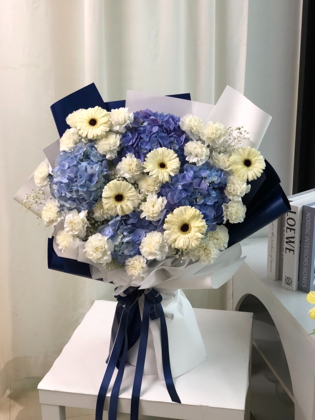 • การดีไซน์: จัดแบบพุ่มกลมขนาดใหญ่ (Large Round Bouquet) เน้นการกระจายดอกเยอร์บีร่าให้เด่นออกมาจากฐานไฮเดรนเยีย ห่อด้วยกระดาษสีน้ำเงินเนวี่ (Navy Blue) ตัดกับกระดาษสีขาวชั้นในสไตล์เกาหลี (Korean Wrapping) ที่เน้นการจับจีบให้ดูมีมิติ