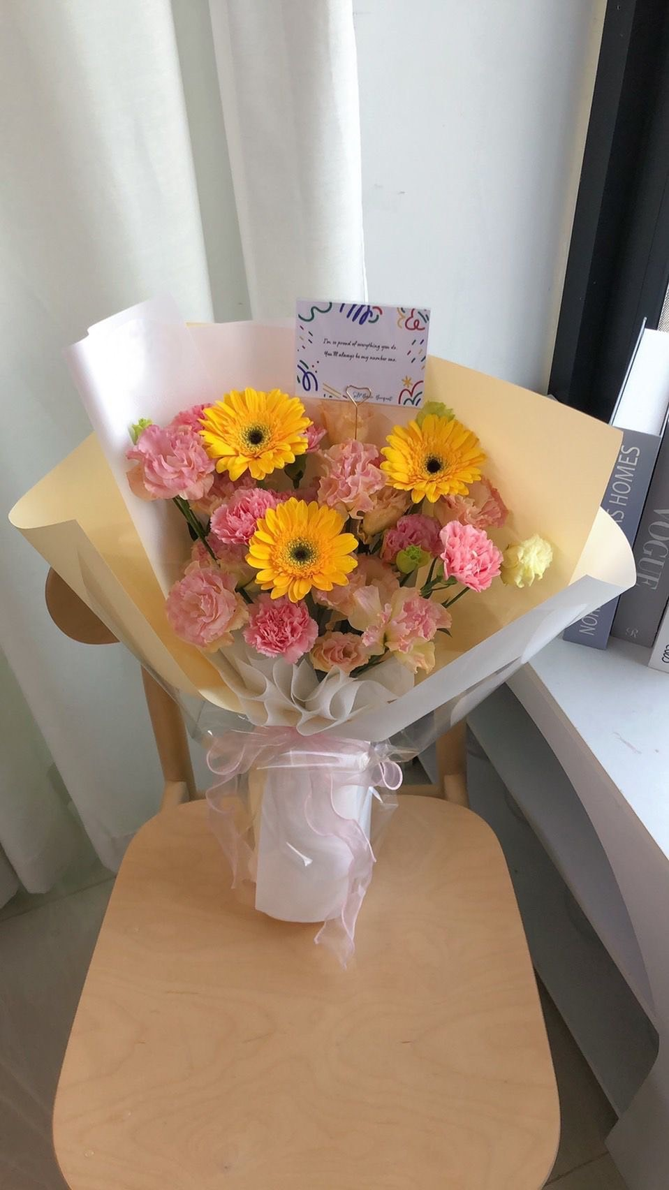 การดีไซน์: จัดช่อทรงพุ่มแบบกระจายตัว (Loose Bouquet Style) ที่ดูเป็นธรรมชาติและไม่เป็นทางการจนเกินไป ห่อด้วยกระดาษสีเหลืองนวลและซ้อนด้วยพลาสติกใสที่ด้านล่างเพื่อให้เห็นโครงสร้างของช่อ