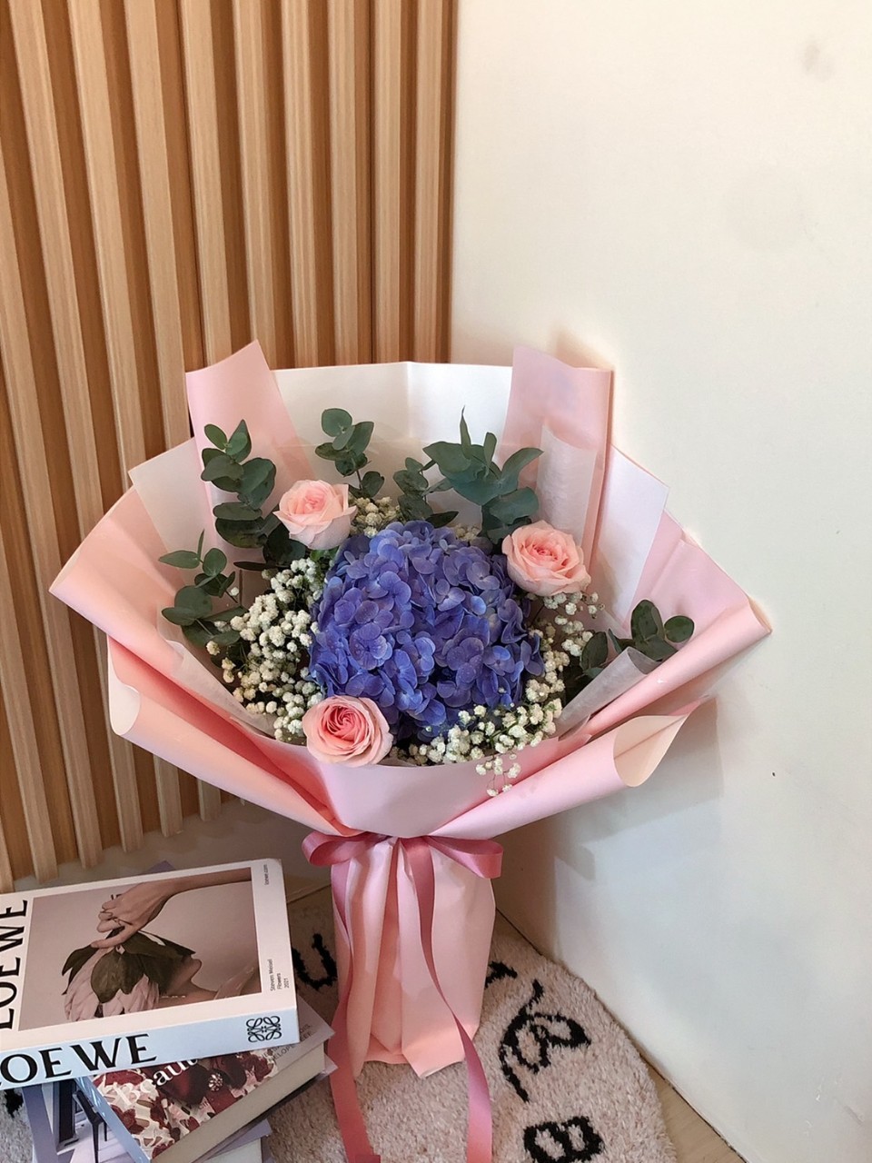 การดีไซน์: จัดทรงกลมแบบเน้นศูนย์กลาง (Focal Point Design) โดยให้ไฮเดรนเยียเด่นอยู่ตรงกลางแล้วกระจายกุหลาบไว้รอบๆ ห่อด้วยกระดาษสีชมพูพาสเทลและสีขาว จับจีบกระดาษให้แผ่กว้างสไตล์เกาหลีเพื่อให้ช่อดูมีมิติและน่าทะนุถนอม
