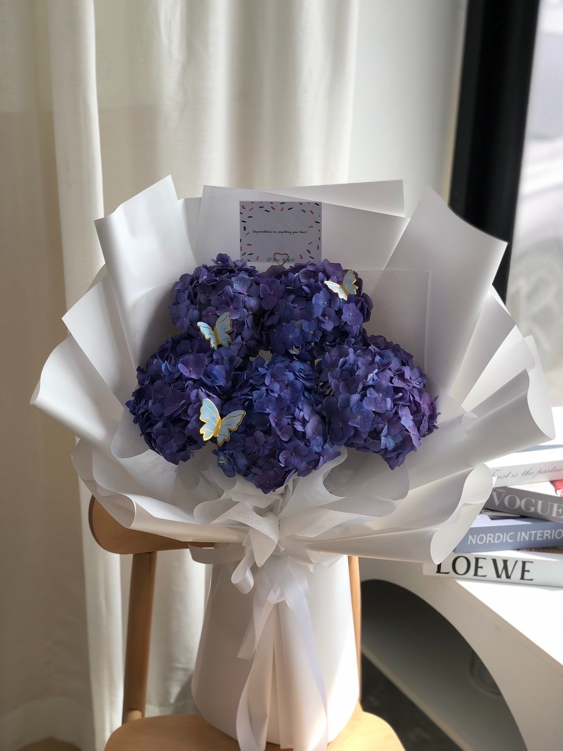 ดอกไม้หลัก: ดอกไฮเดรนเยียสีม่วงเข้ม: สื่อถึงความมั่งคั่ง ความสง่างาม และความรู้สึกที่ลึกซึ้งมั่นคง