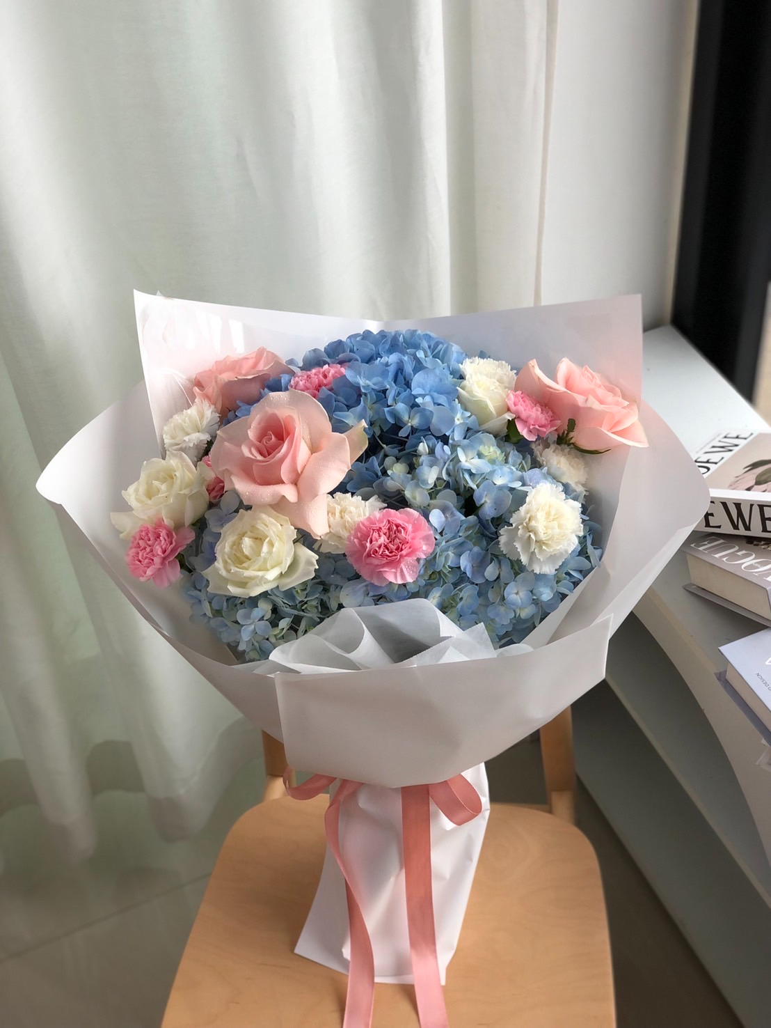 • ดอกคาร์เนชั่นสีขาว (White Carnations): ช่วยเพิ่มผิวสัมผัสที่นุ่มนวลและทำให้ช่อดูหนาแน่น