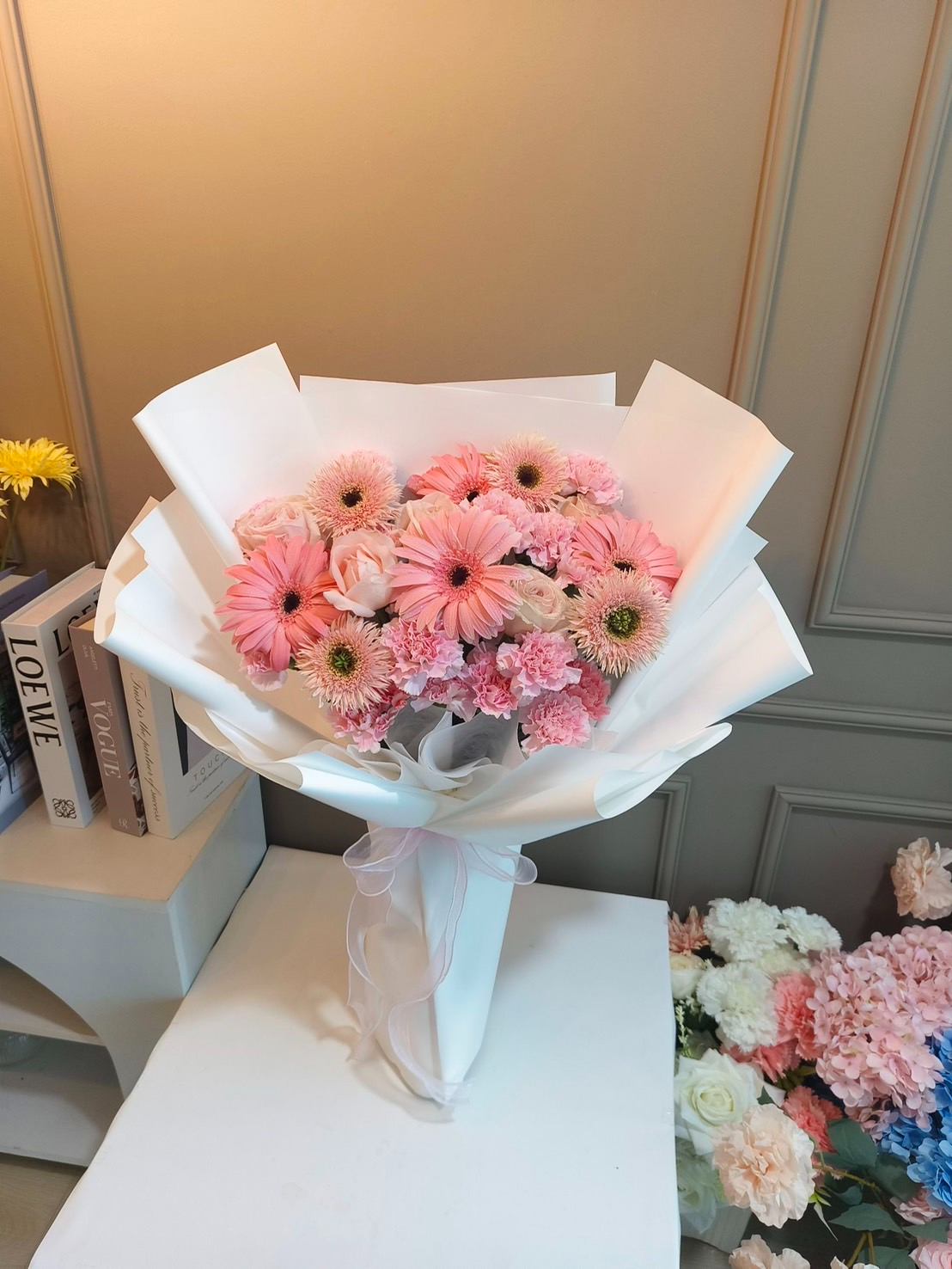 การตกแต่ง: ผูกโบว์ผ้าโปร่งสีชมพูอ่อน (Pink Organza Ribbon) ที่พริ้วไหว ช่วยเสริมบุคลิกของช่อดอกไม้ให้ดูหวานและน่ารักยิ่งขึ้นครับ