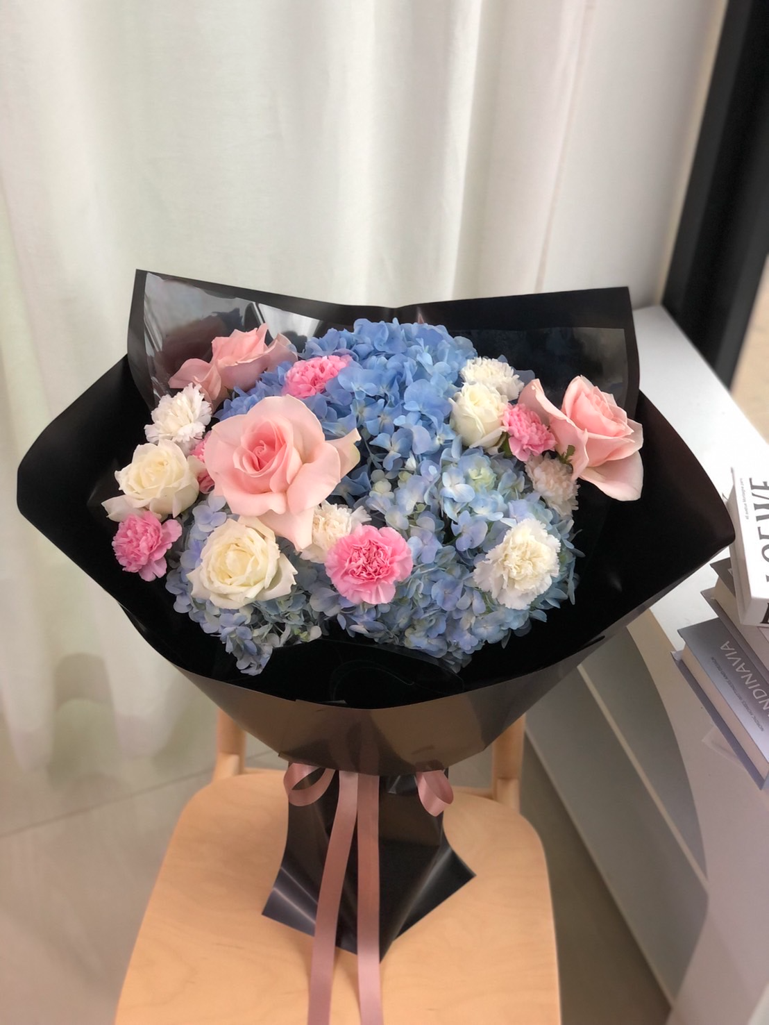 การดีไซน์: จัดช่อเป็นทรงพุ่มกลมขนาดใหญ่ (Round Lush Bouquet) ที่เน้นความอัดแน่นของดอกไม้ ห่อด้วยกระดาษสีดำทรงพัดที่ช่วยเน้นรูปร่างของช่อให้ดูสง่างาม