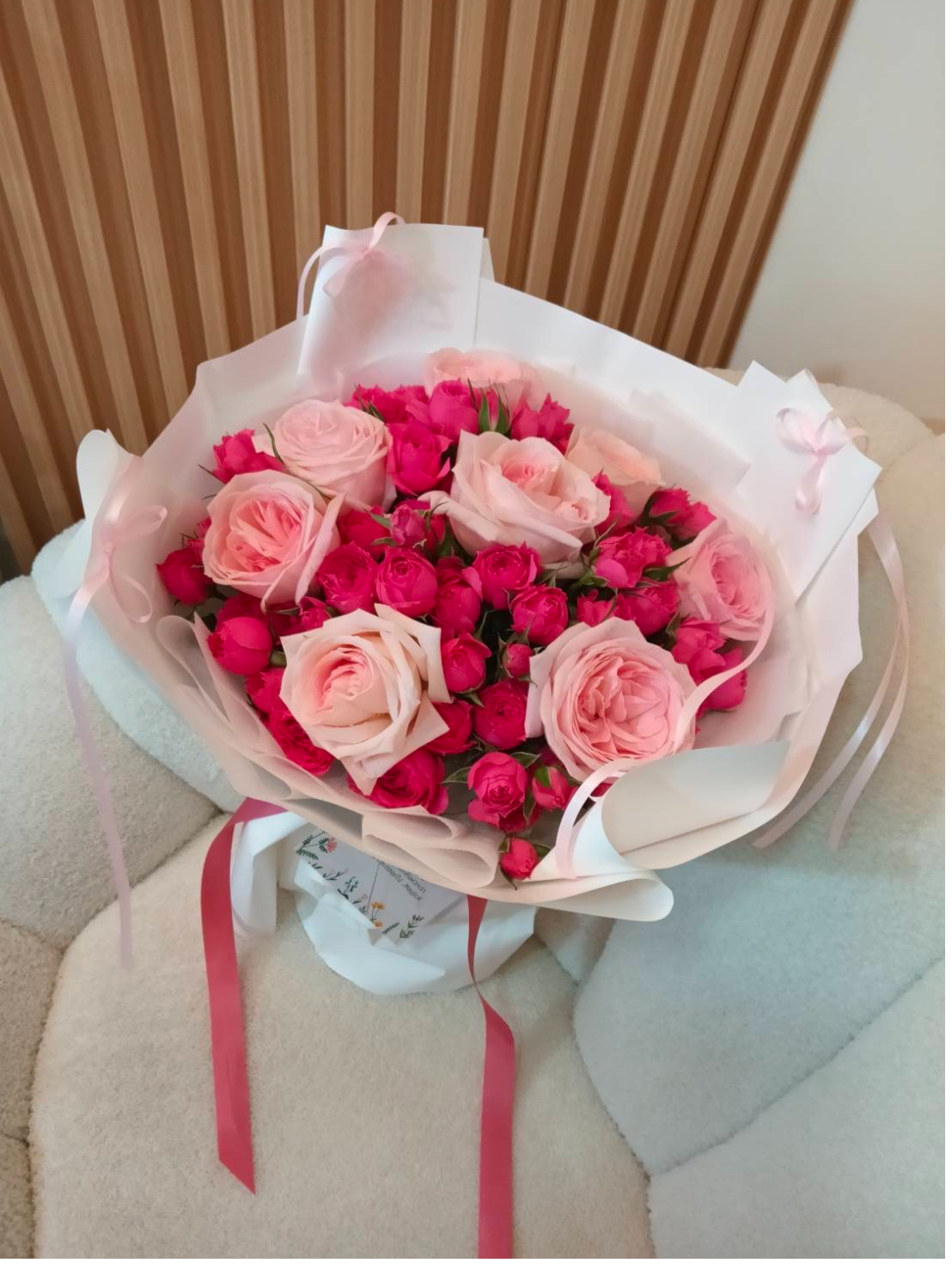 ลูกเล่นพิเศษ: ประดับด้วยโบว์ริบบิ้นเส้นเล็กสีชมพูอ่อนที่ขอบกระดาษห่อ และผูกริบบิ้นเส้นใหญ่สีชมพูบานเย็นปล่อยชายพริ้วไหวที่ก้านช่อ
