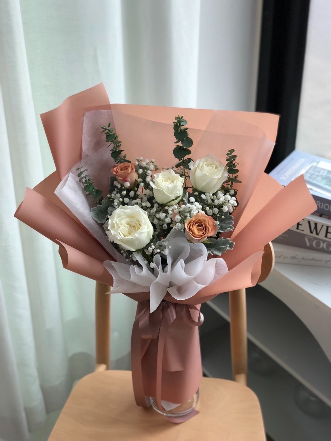 ดอกไม้หลัก: ดอกกุหลาบสีขาวและสีส้มอิฐ (Peach & White Roses) จัดวางสลับกันอย่างสมดุล สื่อถึงความรักที่มั่นคงและการดูแลเอาใจใส่