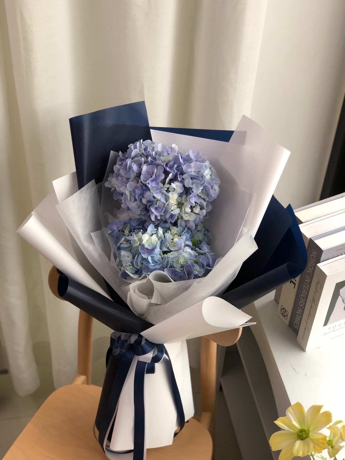 การดีไซน์: โดดเด่นด้วยการเล่นเลเยอร์กระดาษห่อสีน้ำเงินเข้ม (Navy Blue) ตัดกับสีขาวสะอาดตา ให้ลุคที่ดูโมเดิร์นและทรงพลัง