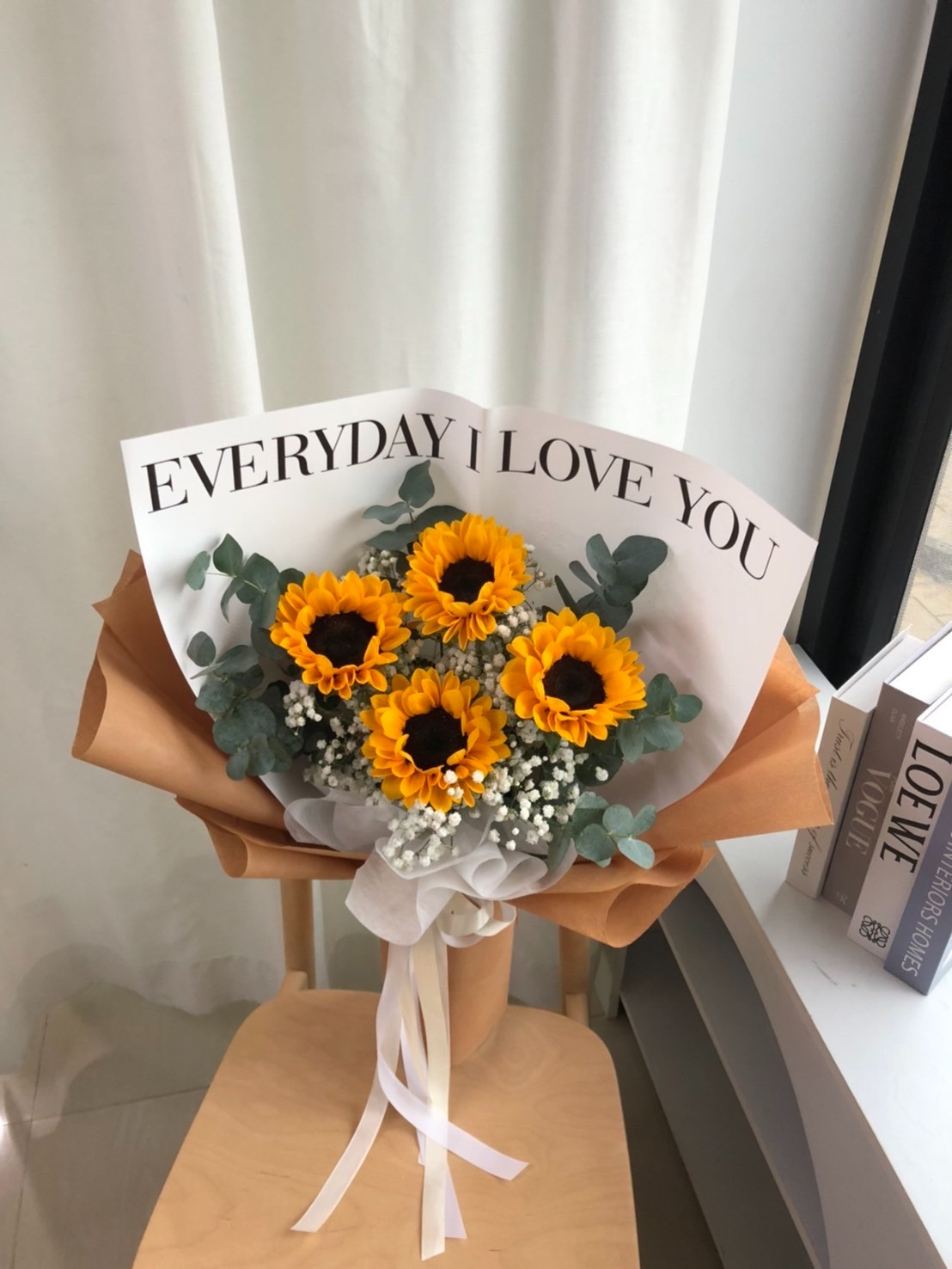 ดอกไม้หลัก: ดอกทานตะวัน (Sunflower) 4 ดอกใหญ่ สีเหลืองทองอร่าม สื่อถึงความรักที่มั่นคง ซื่อสัตย์ และพลังบวกที่ไม่มีวันสิ้นสุด