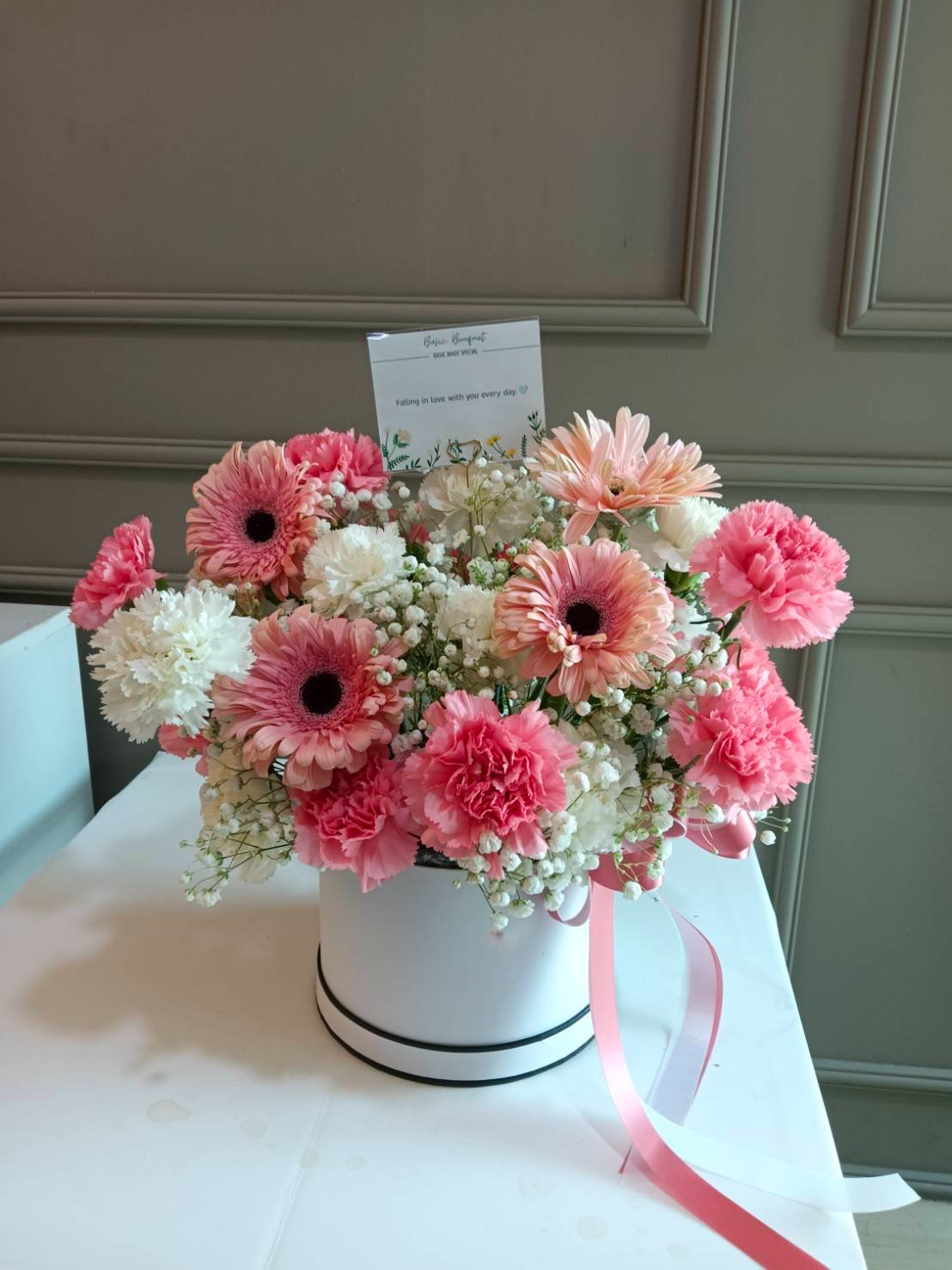 ดอกไม้หลัก: ดอกเยอบีร่า (Gerbera) สีชมพูหวานและสีพีช สื่อถึงความไร้เดียงสาและความเบิกบาน เสริมด้วยดอกคาร์เนชั่น (Carnation) สีชมพูและขาวที่ช่วยให้ช่อดูนุ่มนวลและพรีเมียม